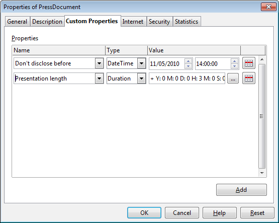 New Custom Properties Handling OpenOffice.org allows users to define any number of custom document properties as name/value pairs in the File > Properties dialog. With version 3.3 it is possible to also define DateTime values and values that contain a duration.
